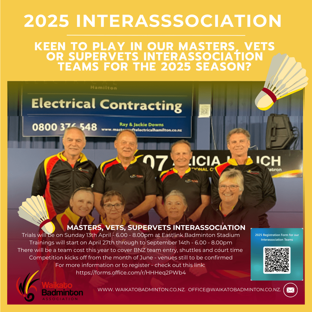 Waikato Badminton currently has one Masters Division teams, two Vets teams and one Super Vets team in the Badminton New Zealand Inter-Association competition. All nominating players are required to attend trials, unless permission has been granted by the selectors.